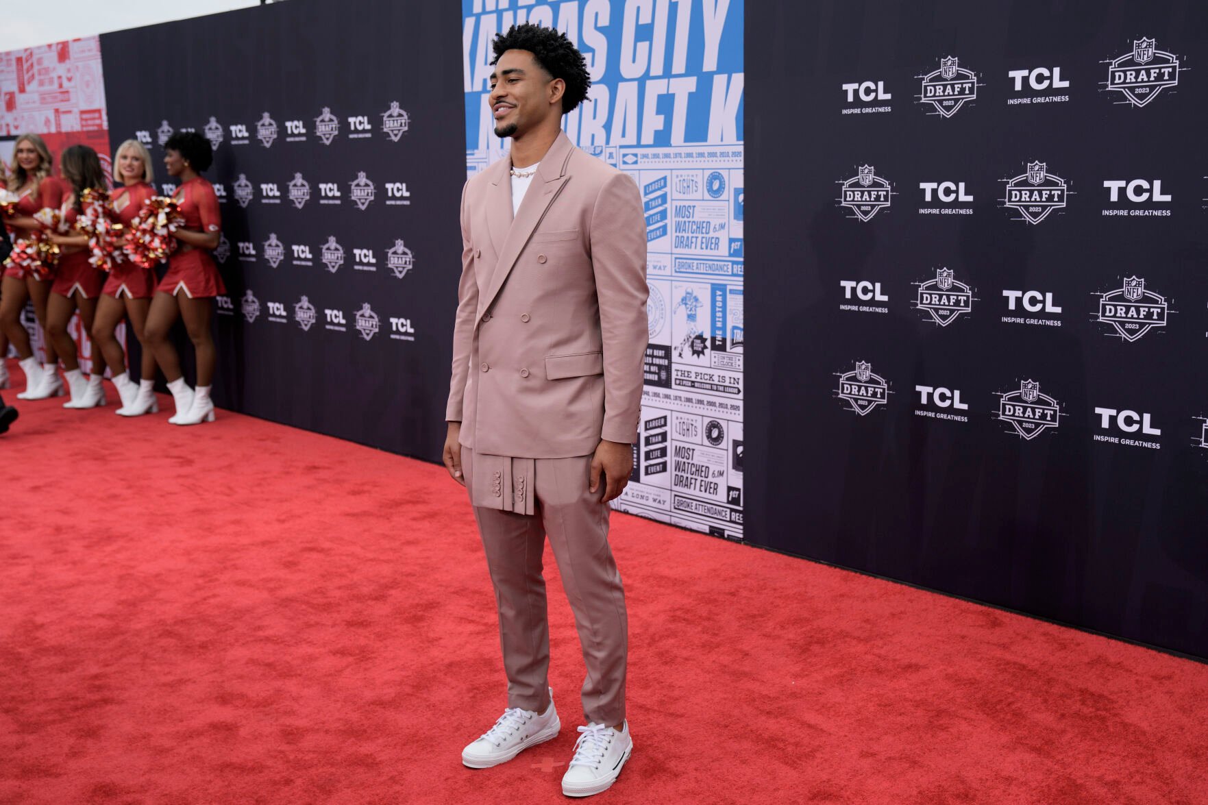 Alabama quarterback Bryce Young arrives on the red carpet before the first round of the NFL football draft, Thursday, April 27, 2023, in Kansas City, Mo. (AP Photo/Charlie Riedel)