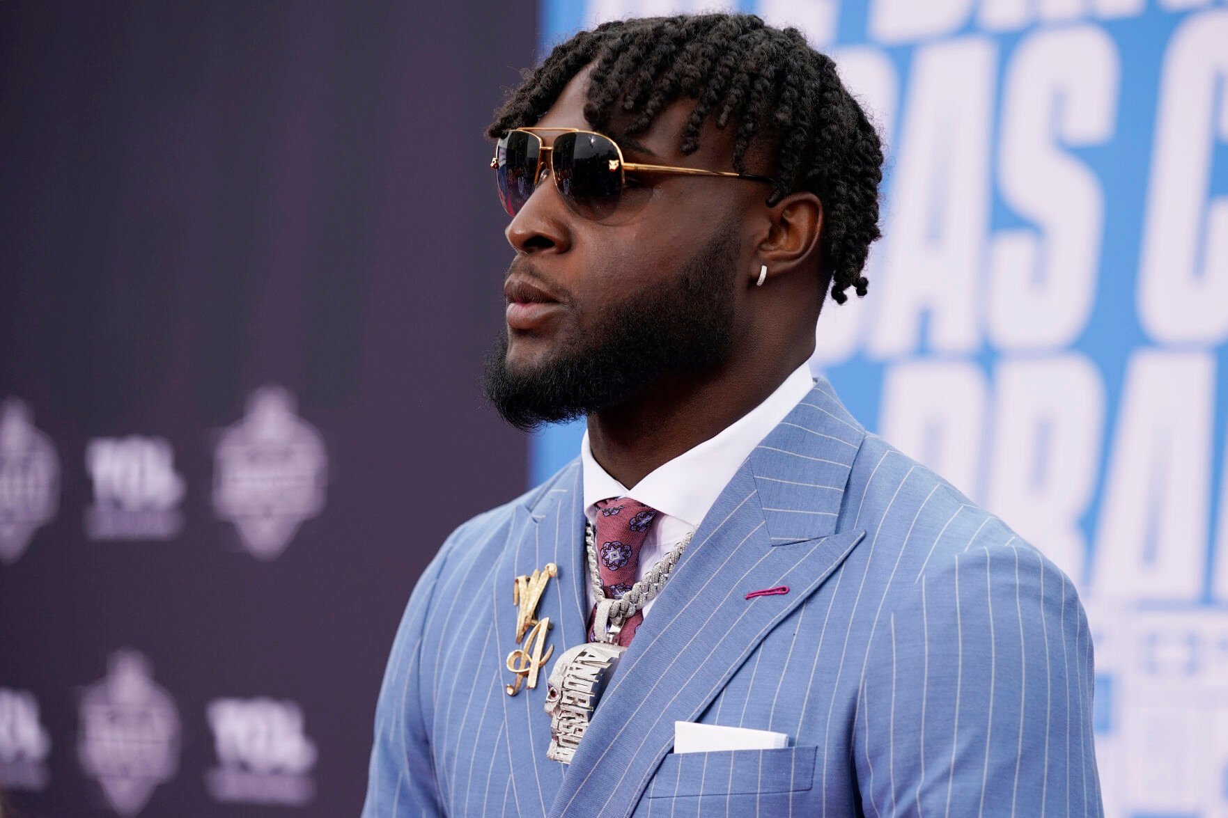 Georgia defensive lineman Jalen Carter arrives on the red carpet before the first round of the NFL football draft, Thursday, April 27, 2023, in Kansas City, Mo. (AP Photo/Charlie Riedel)