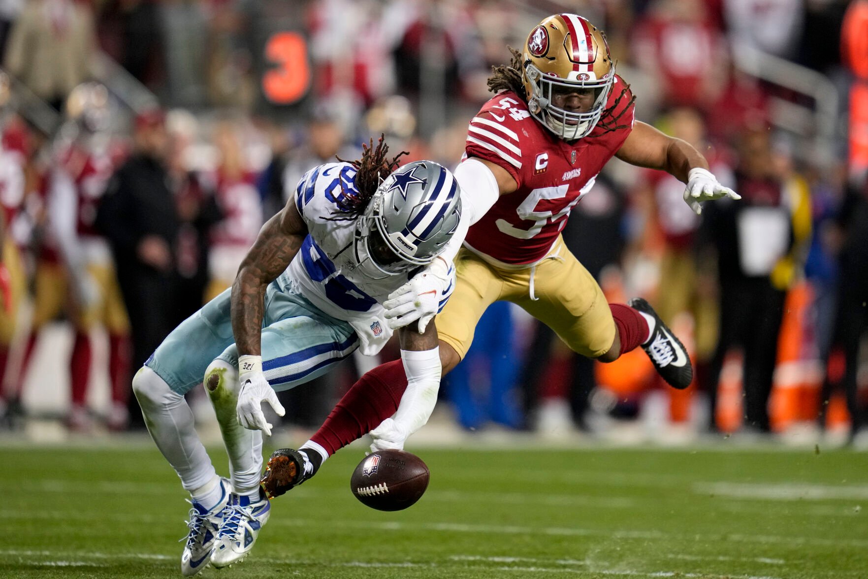 <p>San Francisco 49ers linebacker Fred Warner. right, breaks up a pass intended for Dallas Cowboys wide receiver CeeDee Lamb during the second half of Sunday's NFC divisional round game in Santa Clara, Calif.</p>