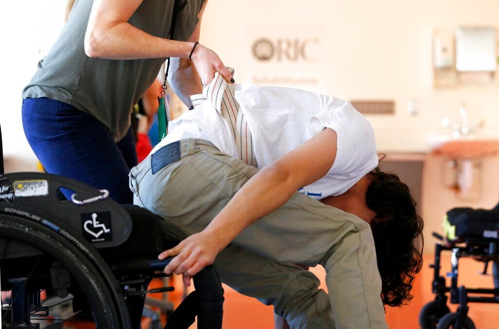 FILE - Jonathan Annicks works on a technique in getting back into his wheelchair with the help from physical therapist Kat Lowery in Chicago on Oct. 8, 2016.