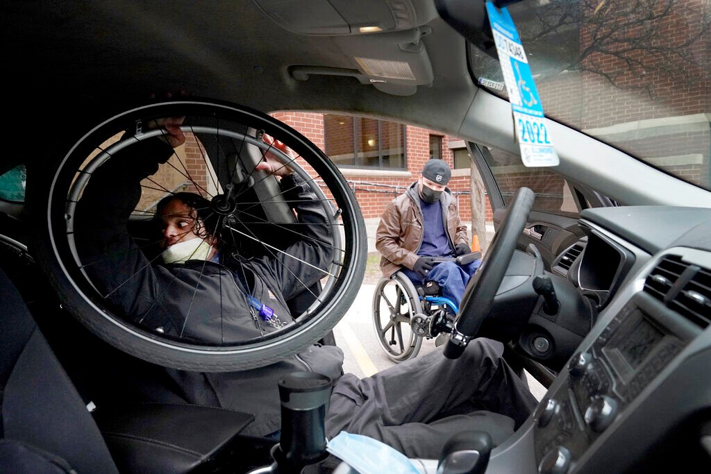 Jonathan Annicks, left, a part-time peer mentor for patients with spinal cord injuries at Schwab Rehabilitation Hospital, demonstrates to Cesar Romero how to get in and out of a car and dismantle a wheel chair for driving Tuesday, March 29, 2022, in Chicago. "If he can do it, I can do it," said Romero, a 45-year-old Chicagoan who worked construction until he was shot and paralyzed last year while on his way to a grocery store.