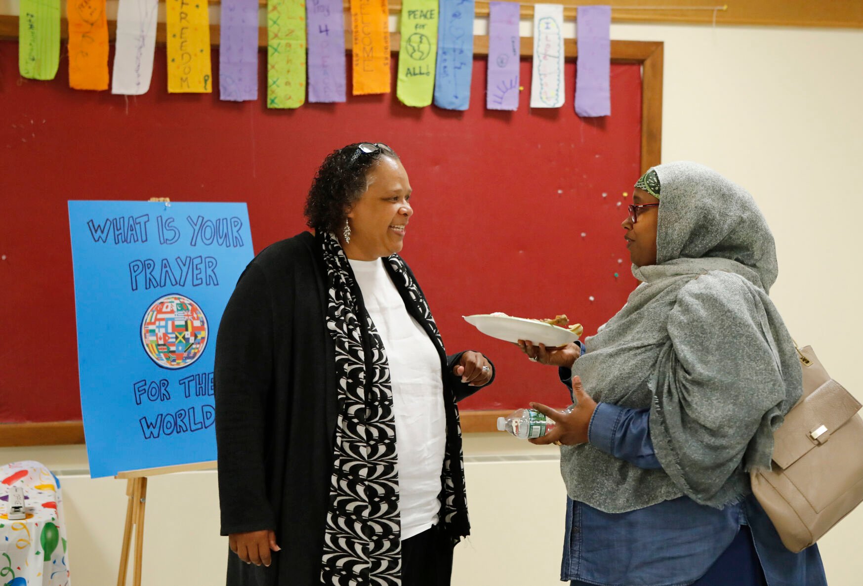 Regina Phillips, left, speaks with Deqa Dhalac, right, at an Eid-al-Fitr celebration on July 9, 2016, in Westbrook, Maine.