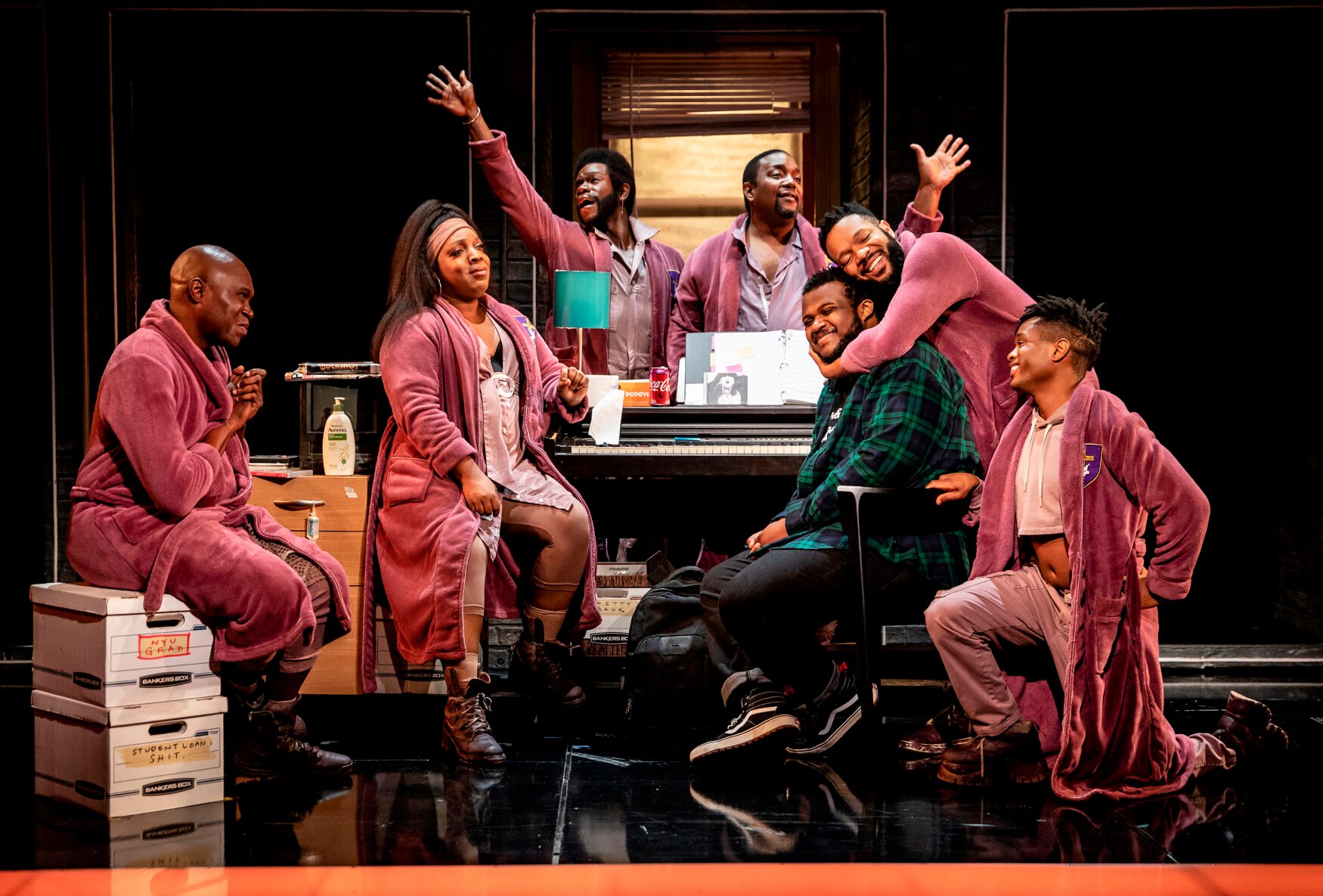 This image released by Polk & Co. shows, from left, James Jackson, Jr., L. Morgan Lee, Antwayn Hopper, John-Andrew Morrison, Jaquel Spivey, Jason Veasey and John-Michael Lyles during a performance of "A Strange Loop." (Marc J. Franklin/Polk & Co. via AP)