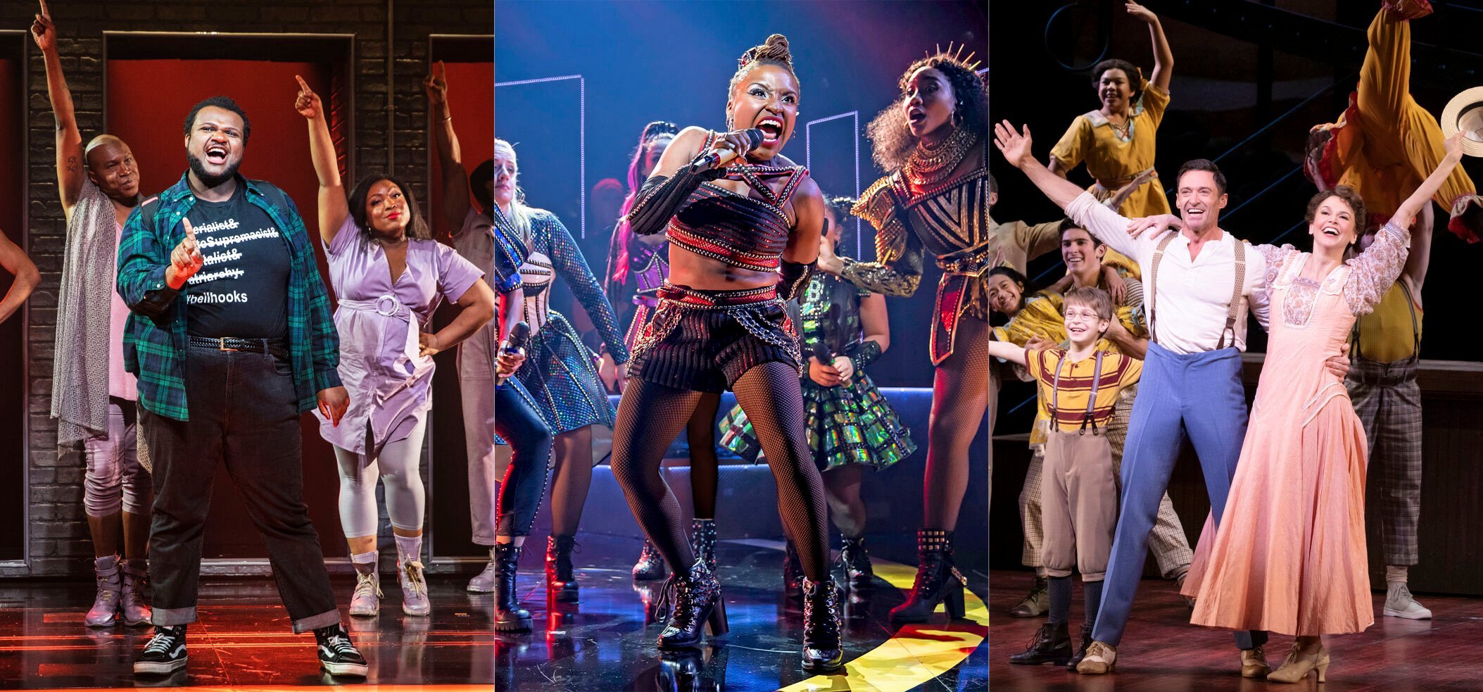 This combination of three separate photos shows, from left, James Jackson, Jr., Jaquel Spivey, L. Morgan Lee during a performance of "A Strange Loop, " Brittney Mack during a performance of "Six," and Hugh Jackman and Sutton Foster during a production of "The Music Man." Nominations for this year's Tony Awards will be announced on Monday, May 9. (Polk & Co. via AP, from left, Boneau/Bryan Brown via AP, O & M Co./DKC via AP)