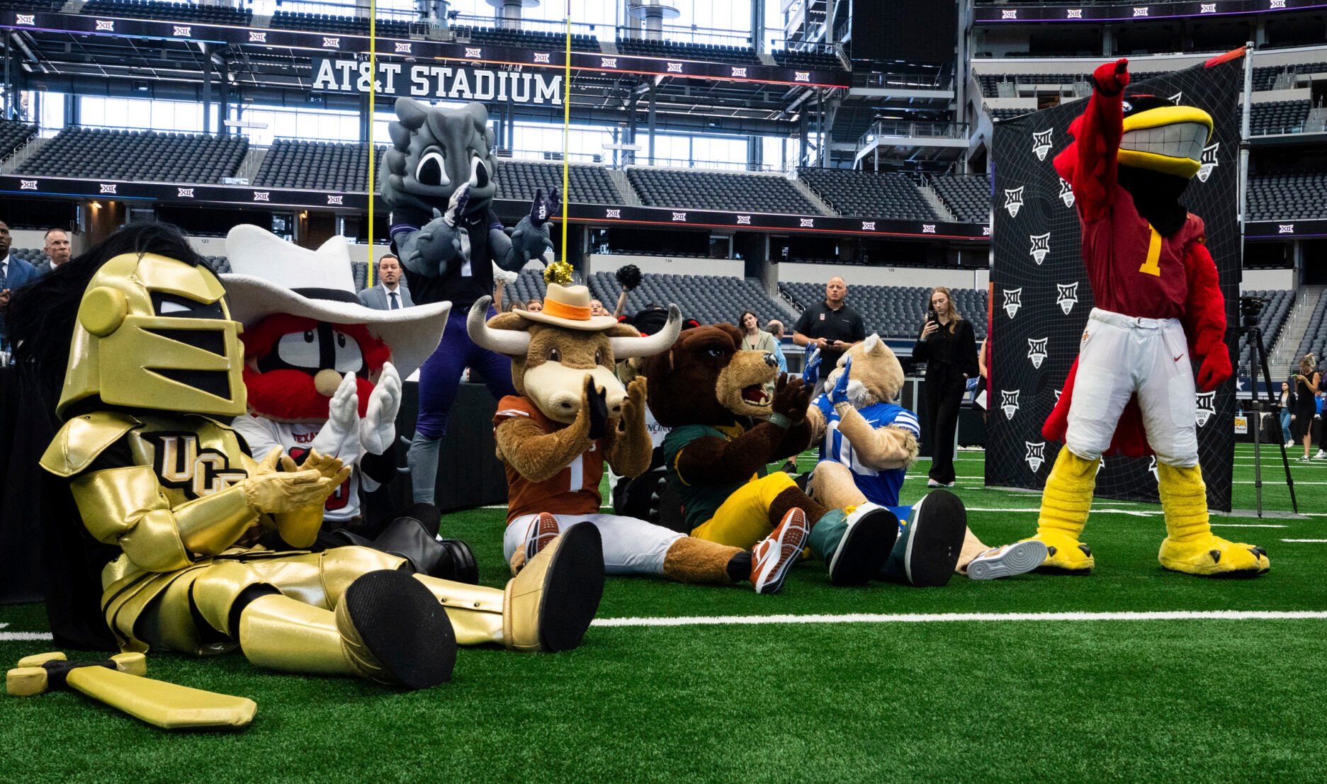 Mascots listen to Big 12 Commissioner Brett Yormack speak at the opening of the Big 12 media days in Arlington, Texas on Wednesday.