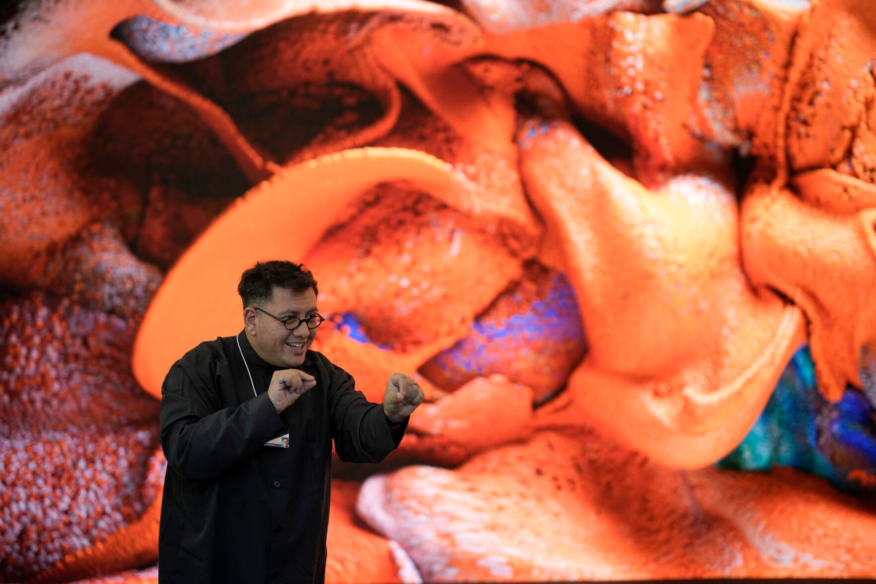 Artist Refik Anadol describes his work inside the Davos Congress Center on Jan. 17 in Davos, Switzerland.