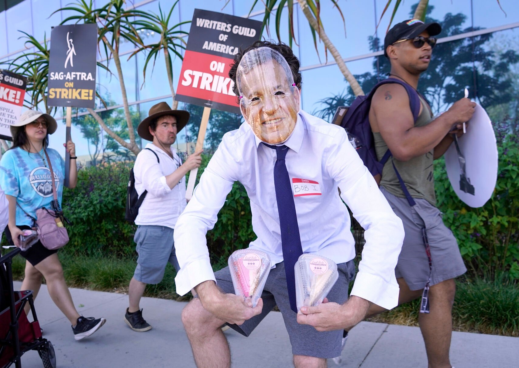 SAG-AFTRA member Gregory Lay, owner of the store East Side Cheesecakes, dresses as Disney CEO Bob Iger as he hands out slices of cake to picketers outside Netflix studios on Tuesday, July 18, 2023, in Los Angeles. The actors strike comes more than two months after screenwriters began striking in their bid to get better pay and working conditions and have clear guidelines around the use of AI in film and television productions. (AP Photo/Chris Pizzello)