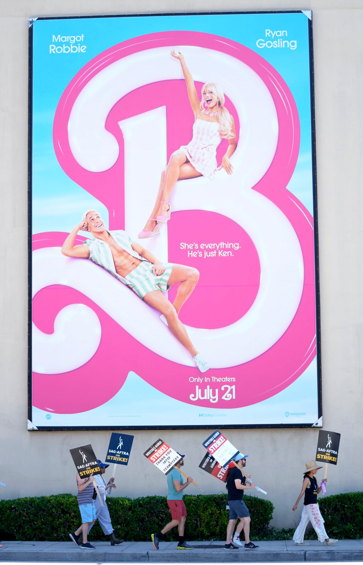 Picketers carry signs past an advertisement for the film "Barbie" outside Warner Bros. studios on Tuesday, July 18, 2023, in Burbank, Calif. (AP Photo/Chris Pizzello)