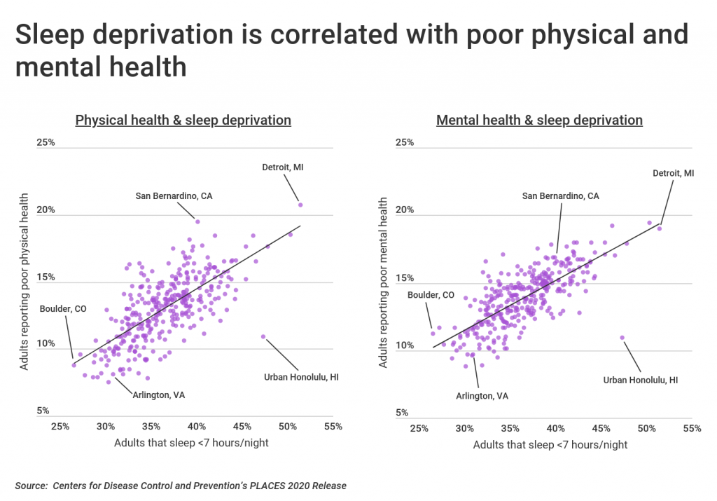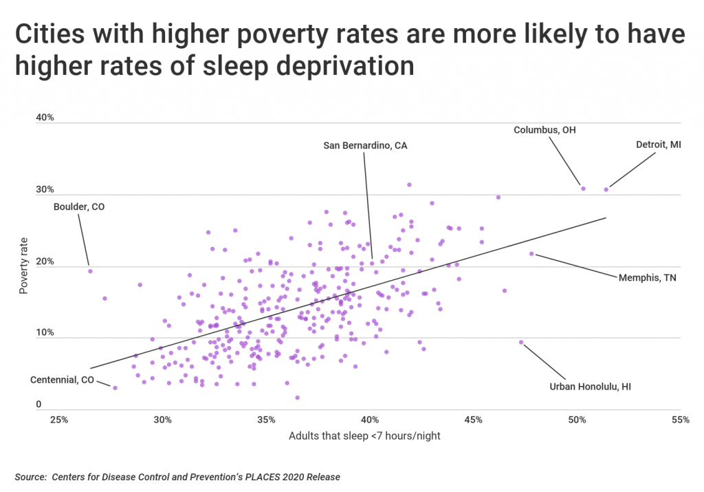 Another major contributing factor in sleep deprivation is poverty. Poverty is highly correlated both with sleep quality and the aforementioned health problems related to sleep. Poor families’ difficulty accessing resources like nutritious food or safe, affordable housing means that they often do not have behaviors or environments conducive to good sleep. Their precarious economic position also creates heightened levels of stress, which has mental and physiological effects that make it more difficult to sleep. This is why, in part, most of the states and cities where residents report the highest levels of sleeplessness are found in economically distressed parts of the Rust Belt, Appalachia, and the South.