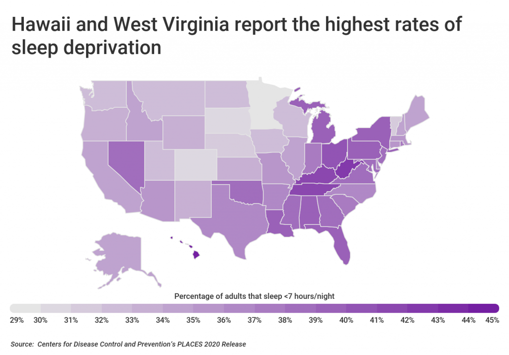 Many facets of modern life contribute to the lack of sleep. One example is technology, as people spend more time in front of brightly-lit devices that disrupt the body’s natural circadian rhythms. But more fundamental patterns of working and living are also at play. Factors like longer commutes and longer working hours in the U.S. workforce may be key reasons why a good night’s rest is harder to come by. This is likely the case in the country’s most sleep-deprived state of Hawaii, where health experts attribute poor sleep to the fact that residents often work longer hours or multiple jobs to account for the state’s high cost of living. Luckily for most Hawaiians, however, the island lifestyle does not tend to produce the same negative physical and mental health outcomes as seen in other sleep-deprived states.
