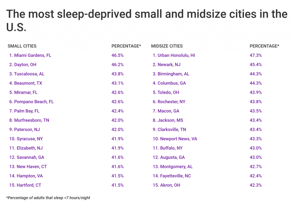 To identify the U.S. locations that are most sleep-deprived, researchers at RetailMeNot evaluated data from the CDC to identify the cities and states where the most adults reported receiving seven hours or less of sleep each night. Their researchers also included other closely related indicators in their analysis, including the share of adults reporting poor physical and mental health outcomes and the local poverty rate.