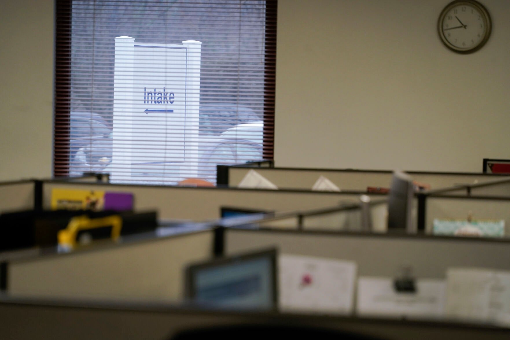 A sign points the way to the entrance to the office where workers field calls at an intake call screening center for the Allegheny County Children and Youth Services office in Penn Hills, Pa., on Thursday, Feb. 17, 2022.