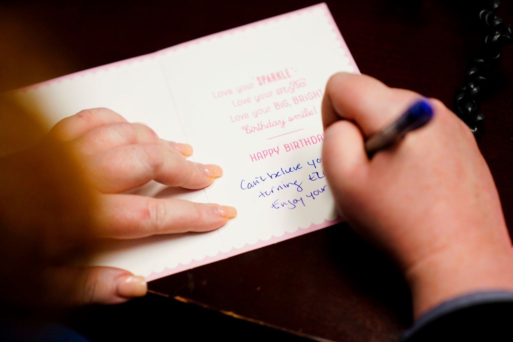 Family law attorney Robin Frank signs a birthday card to send to a former client, in Pittsburgh, Thursday, March 17, 2022. She keeps a birthday calendar for the children she’s helped and sends them handwritten cards to remember times when things went right.
