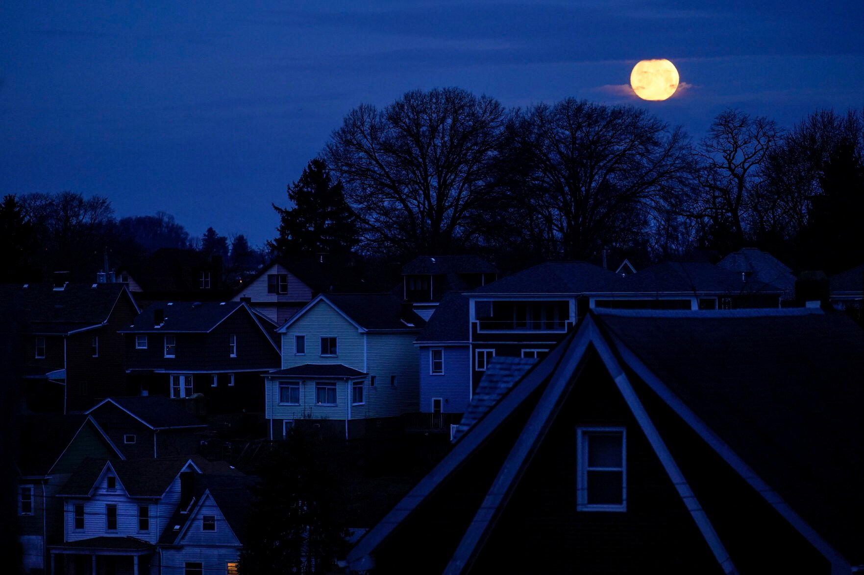 The moon sets behind homes in Pittsburgh, Thursday, March 17, 2022. Around the country, as child welfare agencies use or consider algorithmic tools like in Allegheny County, an Associated Press review has identified a number of concerns about the technology, including questions about its reliability and its potential to harden racial disparities in the child welfare system. (AP Photo/Matt Rourke)