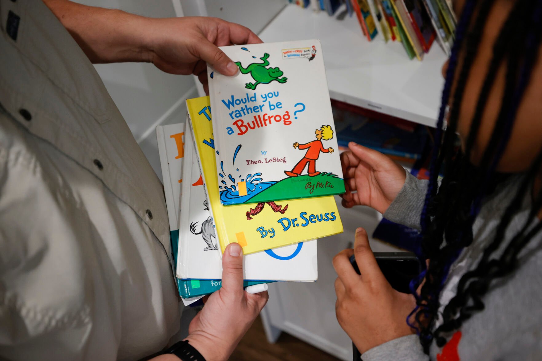 Tim McNeeley, left, helps students pick books to read during an after-school literacy program in Atlanta on Thursday, April 6, 2023. The after-school program is open to students in kindergarten through fifth grade through the Atlanta based Pure Hope Project.