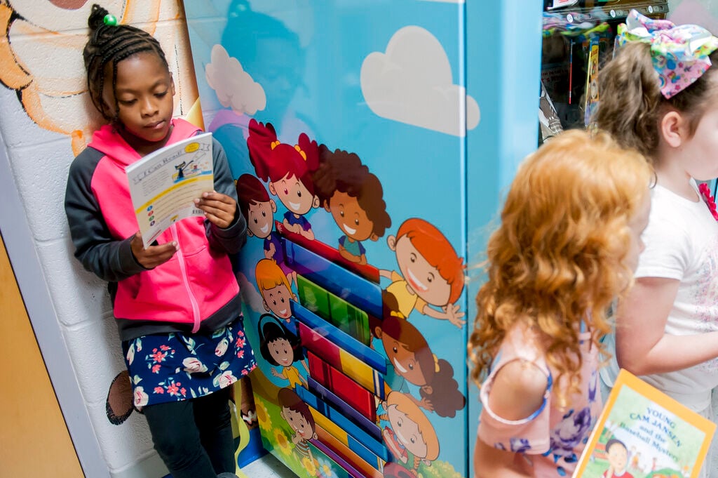 FILE - Janaya Sells, 7, reads a token-bought book on Sept. 26, 2019, during a ribbon cutting for an Inchy the Worm book vending machine at R.E. Stevenson Elementary School in Russellville, Ky.