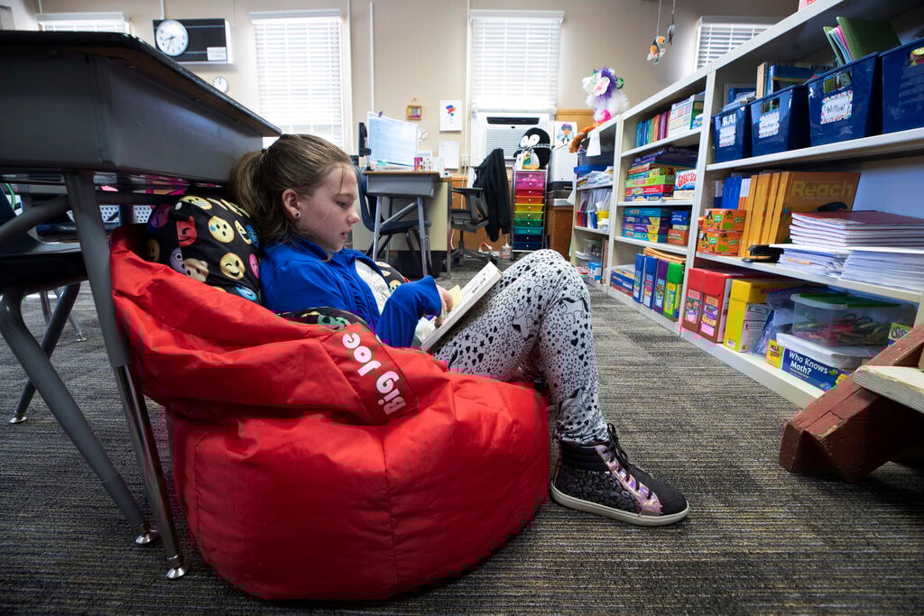 Third-grader Fallon Rawlinson reads a book at Good Springs Elementary School in Good Springs, Nev., on March 30, 2022.