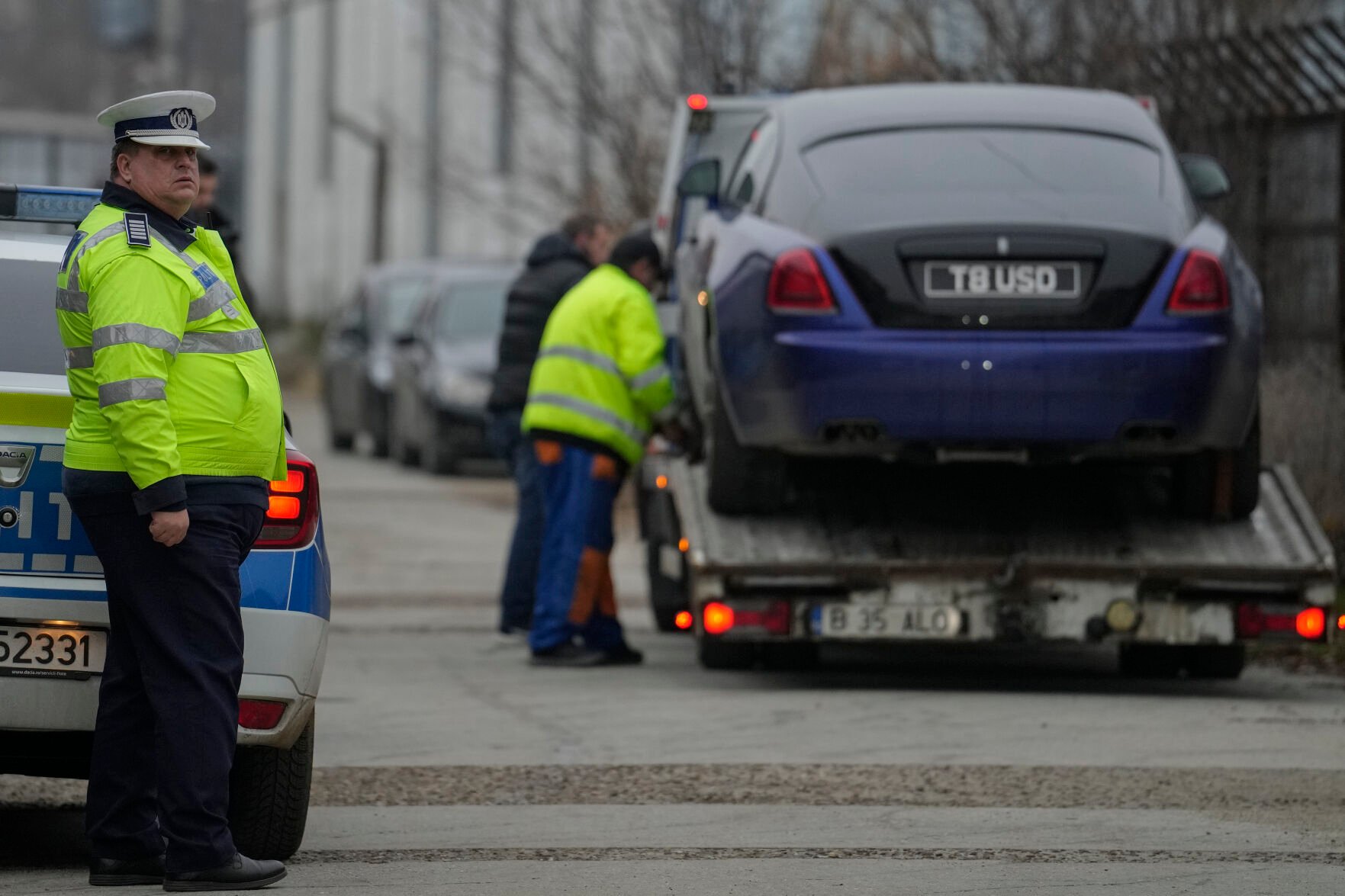A Romanian traffic policeman stands by as men secure a U.K.-registered luxury vehicle, which was seized in a case against media influencer Andrew Tate, to be towed away Saturday on the outskirts of Bucharest, Romania.