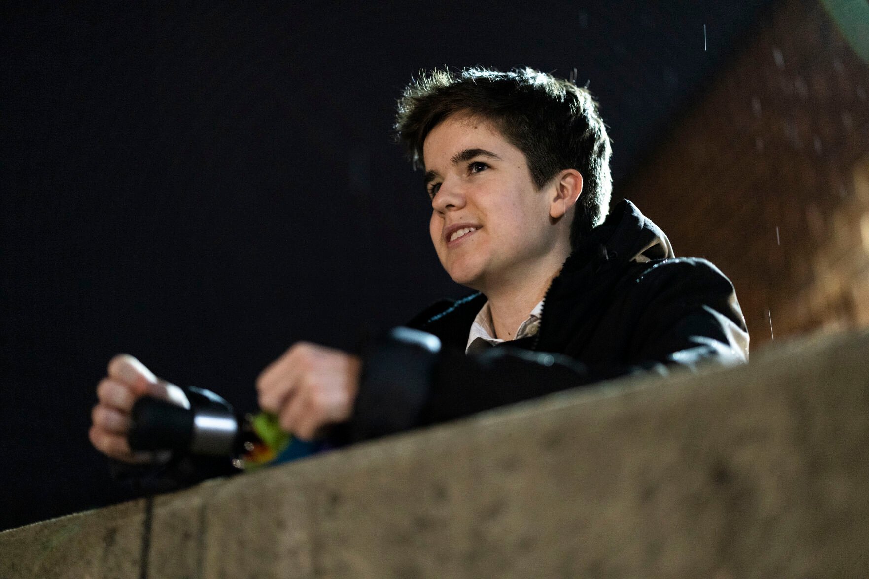 Central Bucks School District high school student Leo Burchell waits outside for a school board meeting to start in Doylestown, Pa., on Nov. 15, 2022.