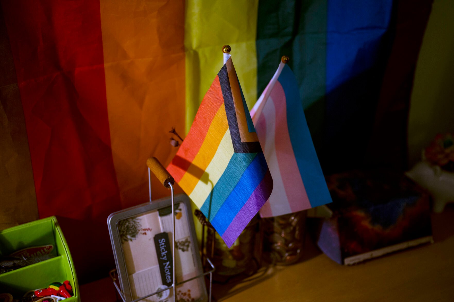 Pride flags are displayed in the bedroom of high school student Leo Burchell in Pennsylvania on Nov. 16, 2022.
