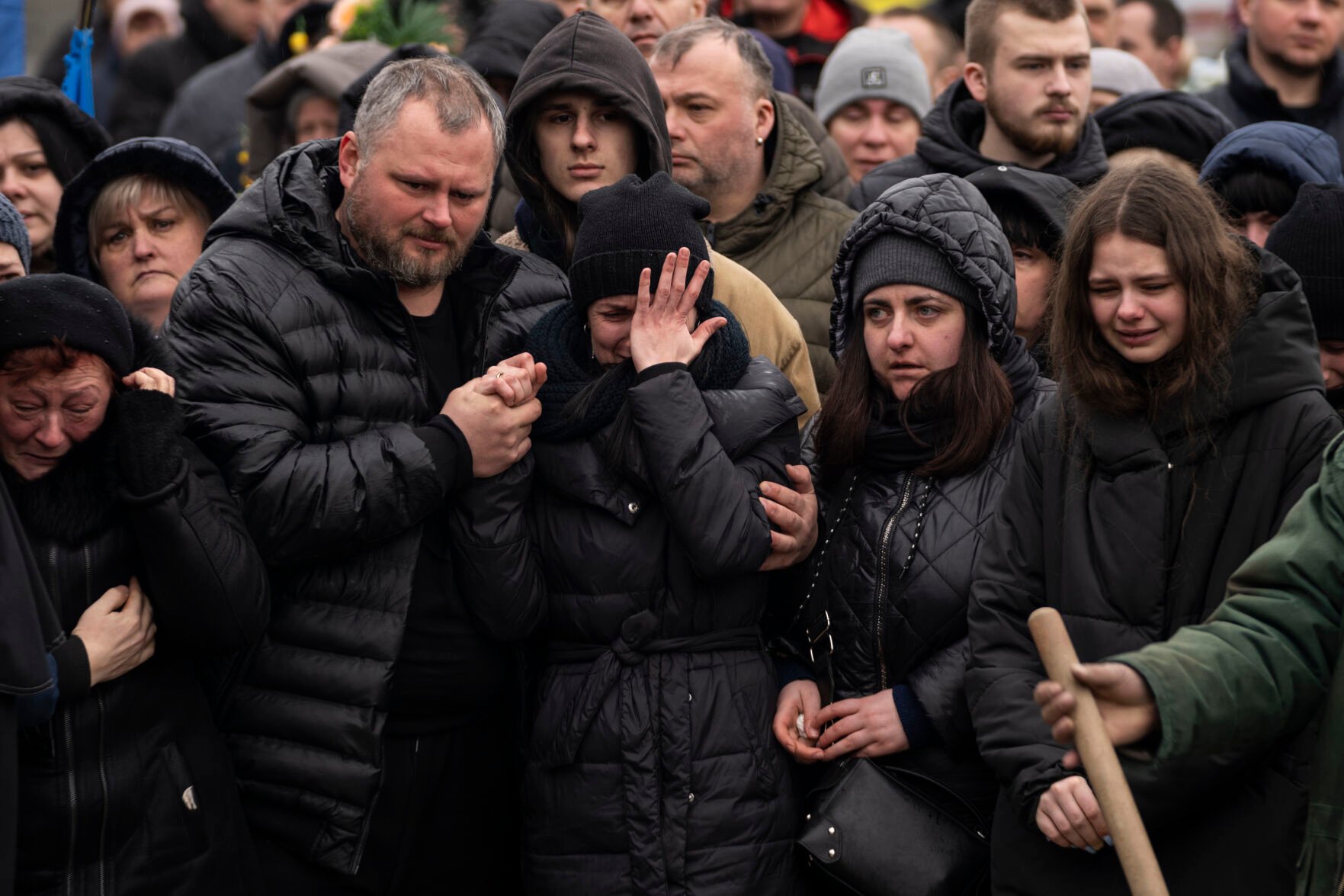 Iryna Tsyhanska, center, is hugged by her brother-in-law Oleg Tsyhanskyi, as her daughter Anna, right, and other family members mourn Friday during a funeral of her husband, soldier Roman Tsyhanskyi, at Lviv cemetery in western Ukraine. Tsyhanskyi died near Bakhmut a week ago.
