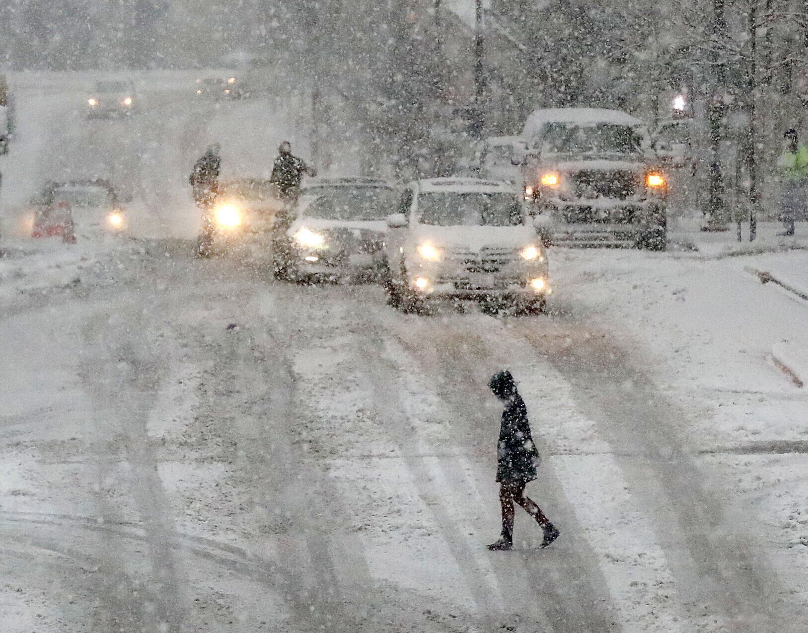 A snow squall — an example of a mesoscale event — affects pedestrian and vehicle traffic Dec. 9 in Madison, Wis.