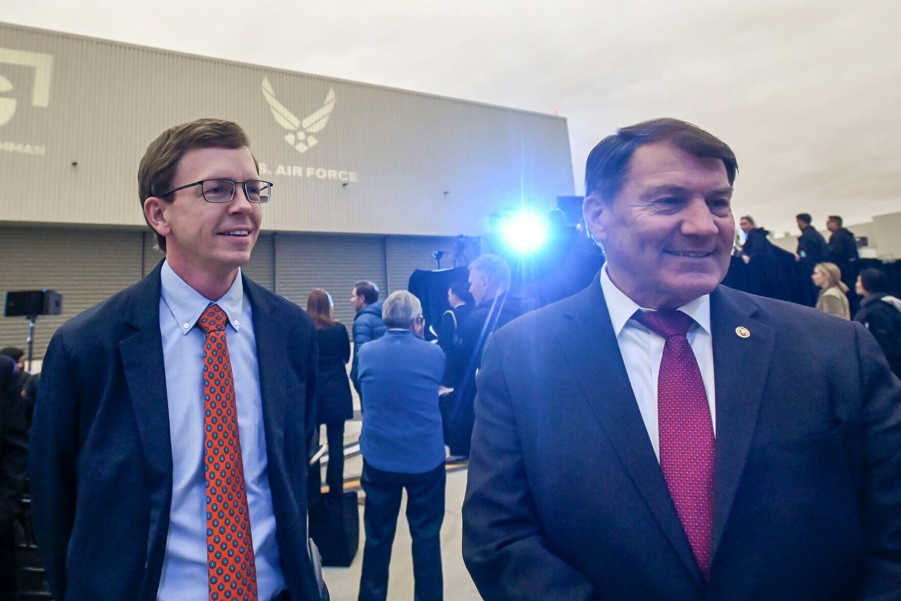 U.S. Rep. Dusty Johnson, R-S.D., left, and U.S. Sen. Mike Rounds, R-S.D., attended the B-21 unveiling ceremony on Friday.