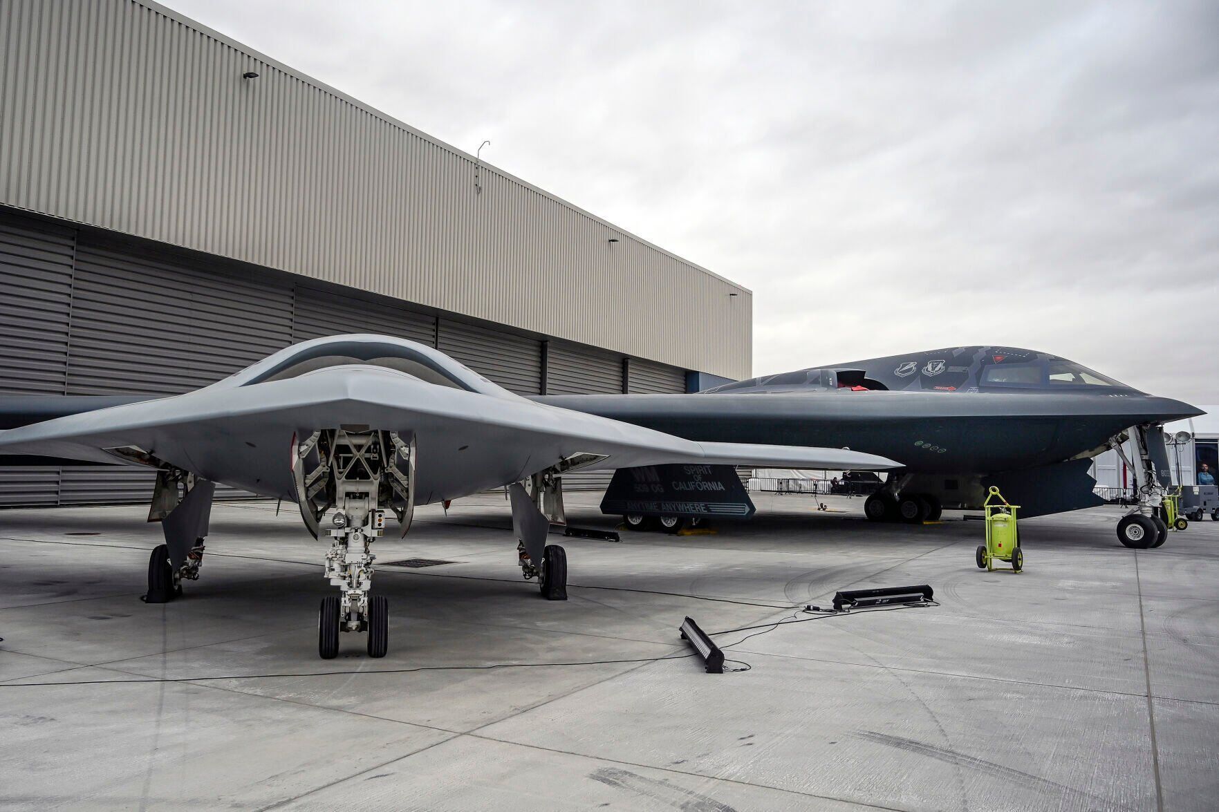 <p>The Northrop Grumman X-47B, left, and Northrop B-2 Spirit, also known as the "Stealth Bomber," were on display during an expo ahead of the B-21 unveiling ceremony on Friday.</p>