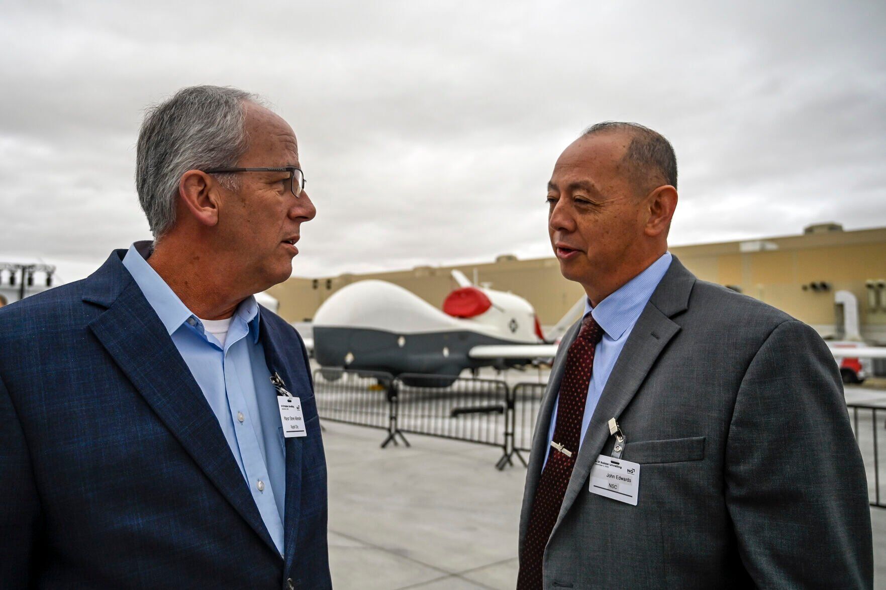 Rapid City Mayor Steve Allender, left, is greeted by Gen. John R. Edwards, a member of the National Security Council and former commander of the 28th Bomb Wing at Ellsworth Air Force Base, while attending an expo ahead of the B-21 unveiling ceremony on Friday at Air Force Plant 42, Site 4, Northrop Grumman in Palmdale, Calif.