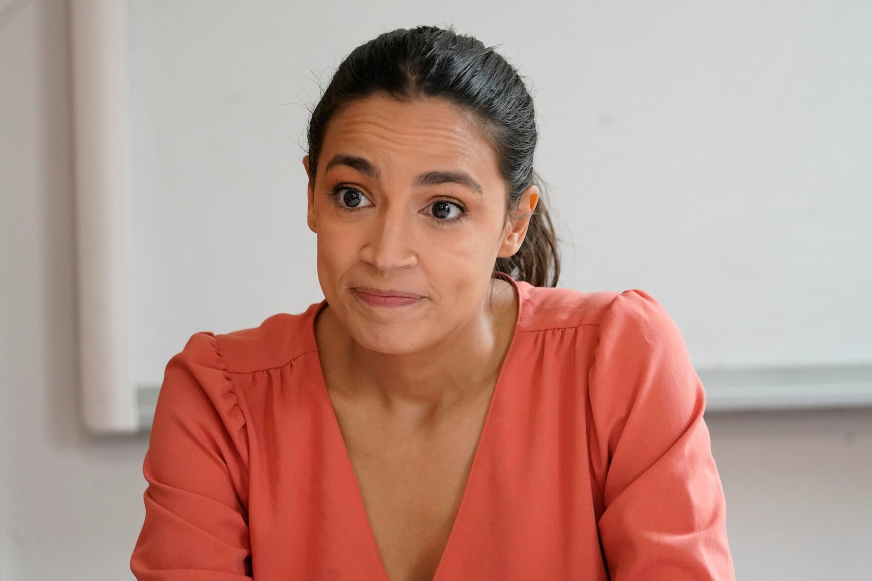 Rep. Alexandria Ocasio-Cortez, D-N.Y., is seen during a meeting at the Chhaya Community Development Corporation on July 6, 2022, in the Jackson Heights neighborhood of the Queens borough of New York.