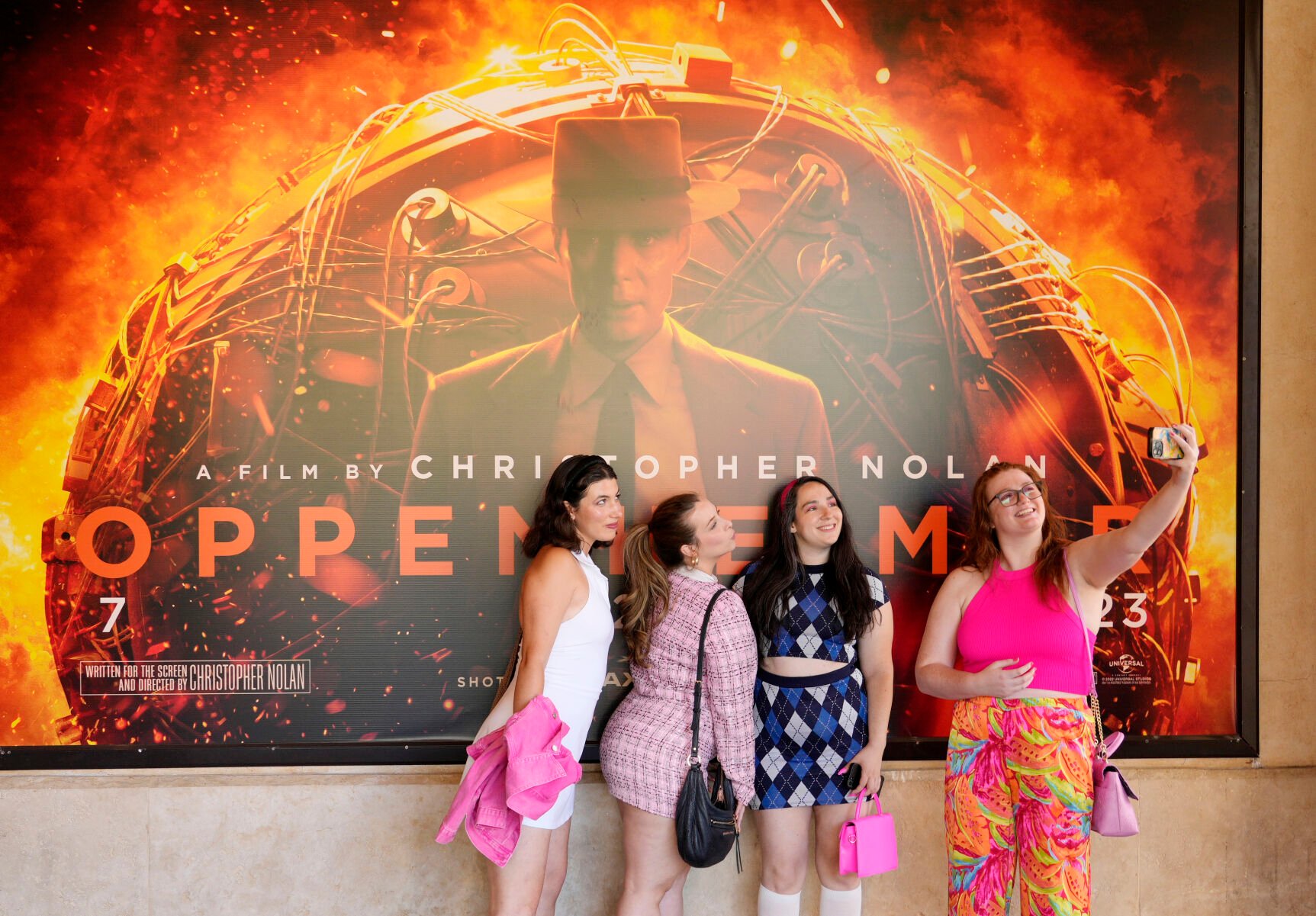 From left, Gabrielle Roitman, Kayla Seffing, Maddy Hiller and Casey Myer take a selfie Thursday in front of an "Oppenheimer" movie poster before they attended an advance screening of "Barbie" at AMC The Grove 14 theaters in Los Angeles.