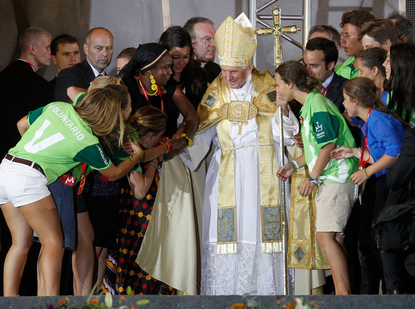 Pilgrims react as they approach Pope Benedict XVI and kiss his right hand Aug. 20, 2011, at Cuatro Vientos airport in Madrid, Spain.