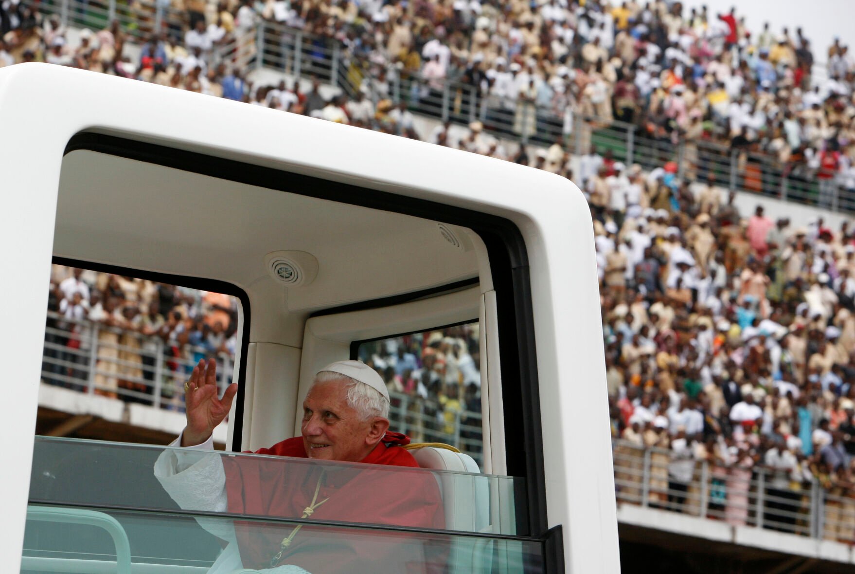 Pope Benedict XVI waves to faithful March 19, 2009, as he leaves after a special Mass at the Amadou Ahidjo stadium in Yaounde, Cameroon.
