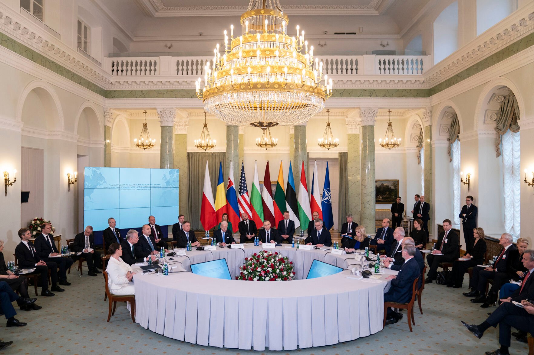 President Joe Biden participates in a meeting Wednesday with the leaders of the Bucharest Nine, a group of nine countries that make up the eastern flank of NATO, in Warsaw, Poland.
