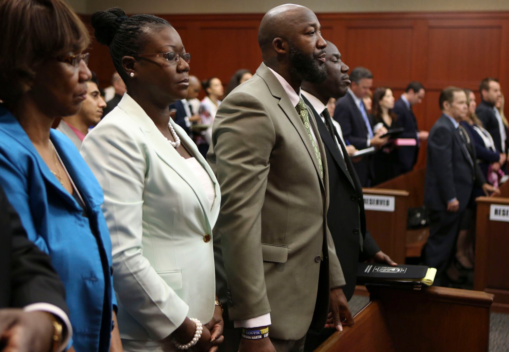 FILE - Trayvon Martin's parents, Sybrina Fulton, second from left, and Tracy Martin, stand in court as the jury leaves the courtroom to deliberate during George Zimmerman's trial in Seminole County, Fla., circuit court, July 12, 2013, in Sanford, Fla. Zimmerman was charged with second-degree murder for the 2012 shooting death of Trayvon, but was later aquitted. The Black Lives Matter movement hits a milestone on Thursday, July 13, 2023, marking 10 years since its 2013 founding in response to Zimmerman's acquittal. (Gary W. Green/Orlando Sentinel via AP, Pool, File)