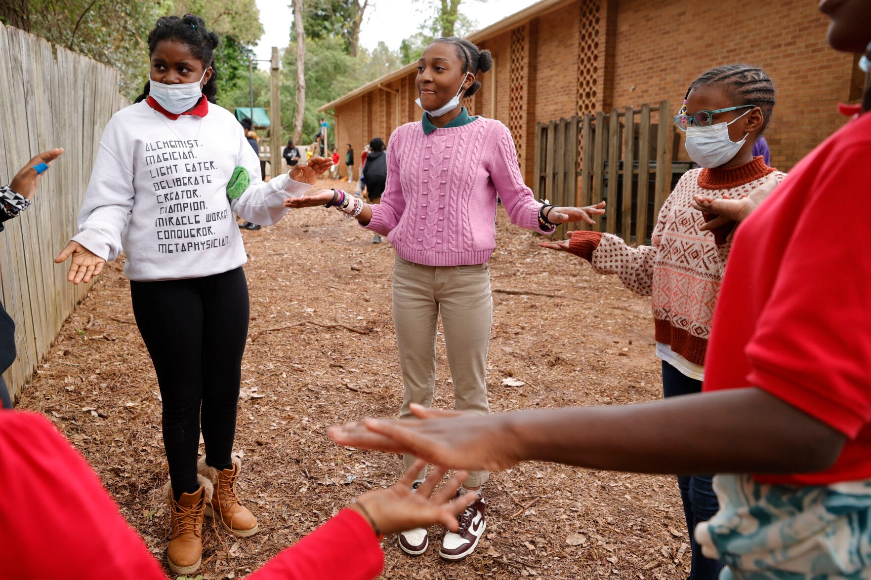 From left, Porter Ovuya, 10, of Moreland, Ga.; Shashu Welcome, 12, of Smyrna, Ga., and Lilliyn Jean, 9, of Tucker, Ga., play games with others during recess March 28 at the Kilombo Academic and Cultural Institute in Decatur, Ga.