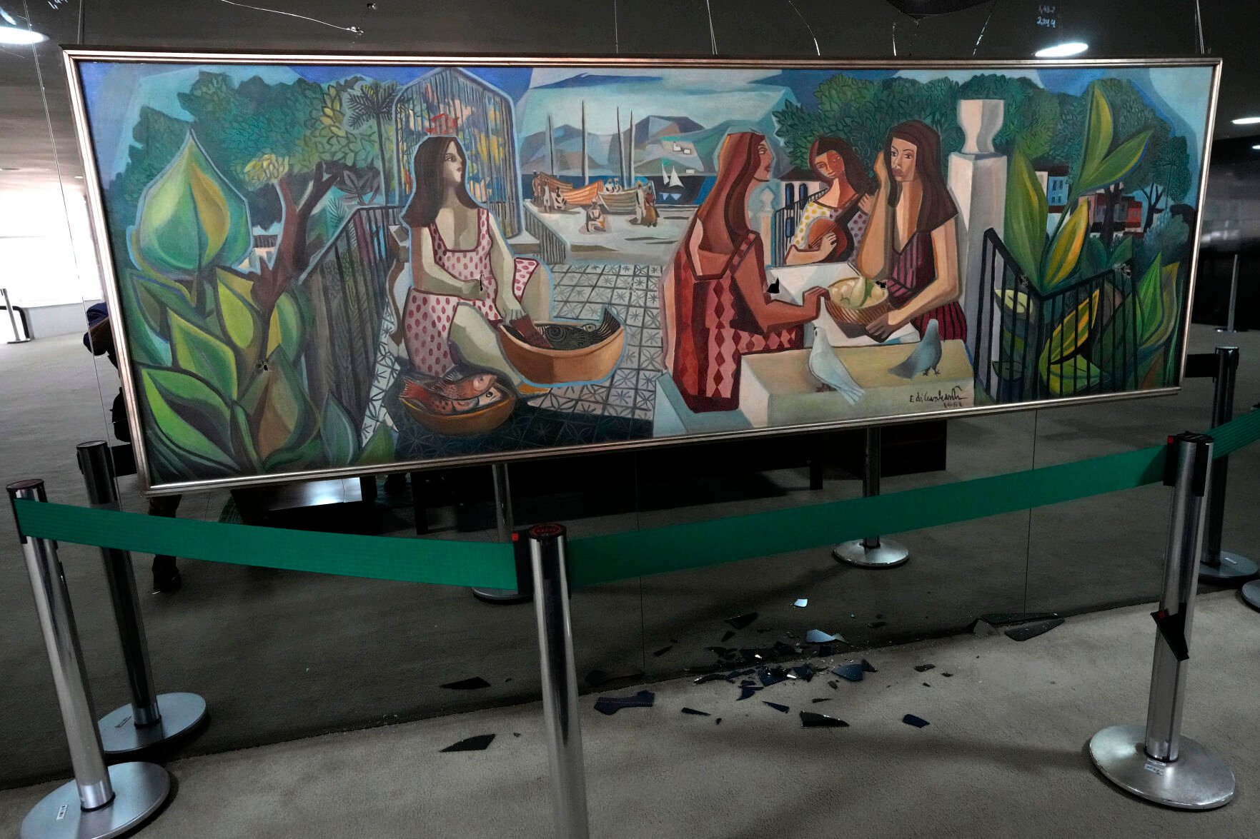The damaged artwork titled "As Mulatas" by Brazilian artist Di Cavalcanti is displayed Jan. 11 in the entrance hall of the presidential office at Planalto Palace, after the storming of public buildings by supporters of former President Jair Bolsonaro in Brasilia, Brazil.