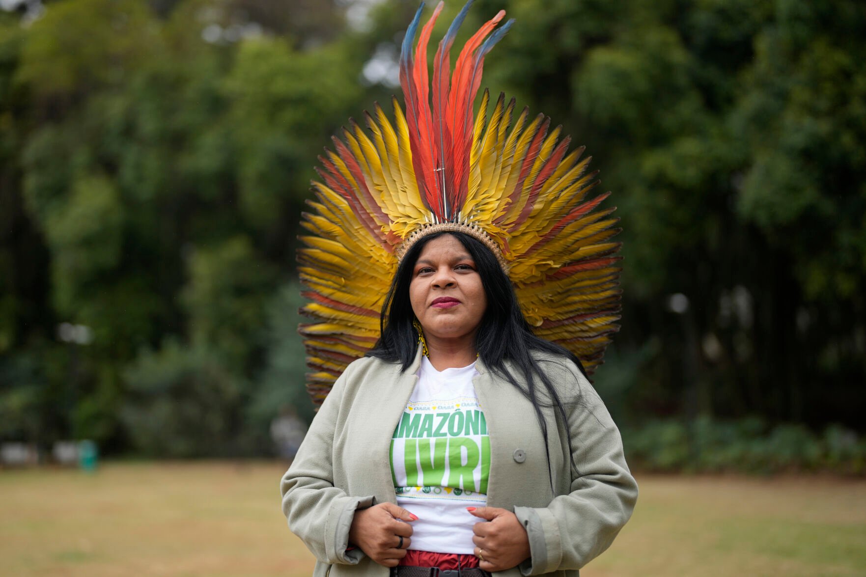 FILE - Indigenous leader Sonia Guajajara from the Guajajara ethnic group poses for a photo during a protest against Violence, illegal logging, mining and ranching, and to demand government protection for their reserves, one day before the celebration of "Amazon Day", in Sao Paulo, Brazil, Sunday, Sept. 4, 2022.