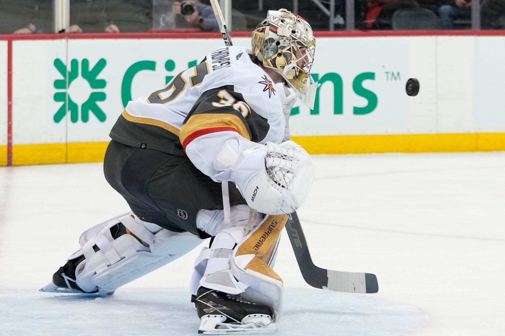 Vegas Golden Knights goaltender Logan Thompson makes a save against the New Jersey Devils during the second period of a Jan. 24 game in Newark, N.J.