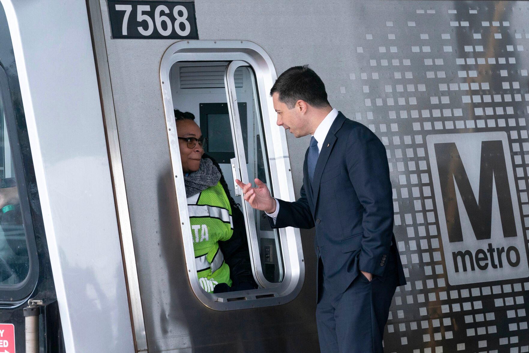 Transportation Secretary Pete Buttigieg speaks to a metro worker Nov. 15, 2022, during the opening of new Silver Line Extension at Washington Dulles International Airport in Chantilly, Va.