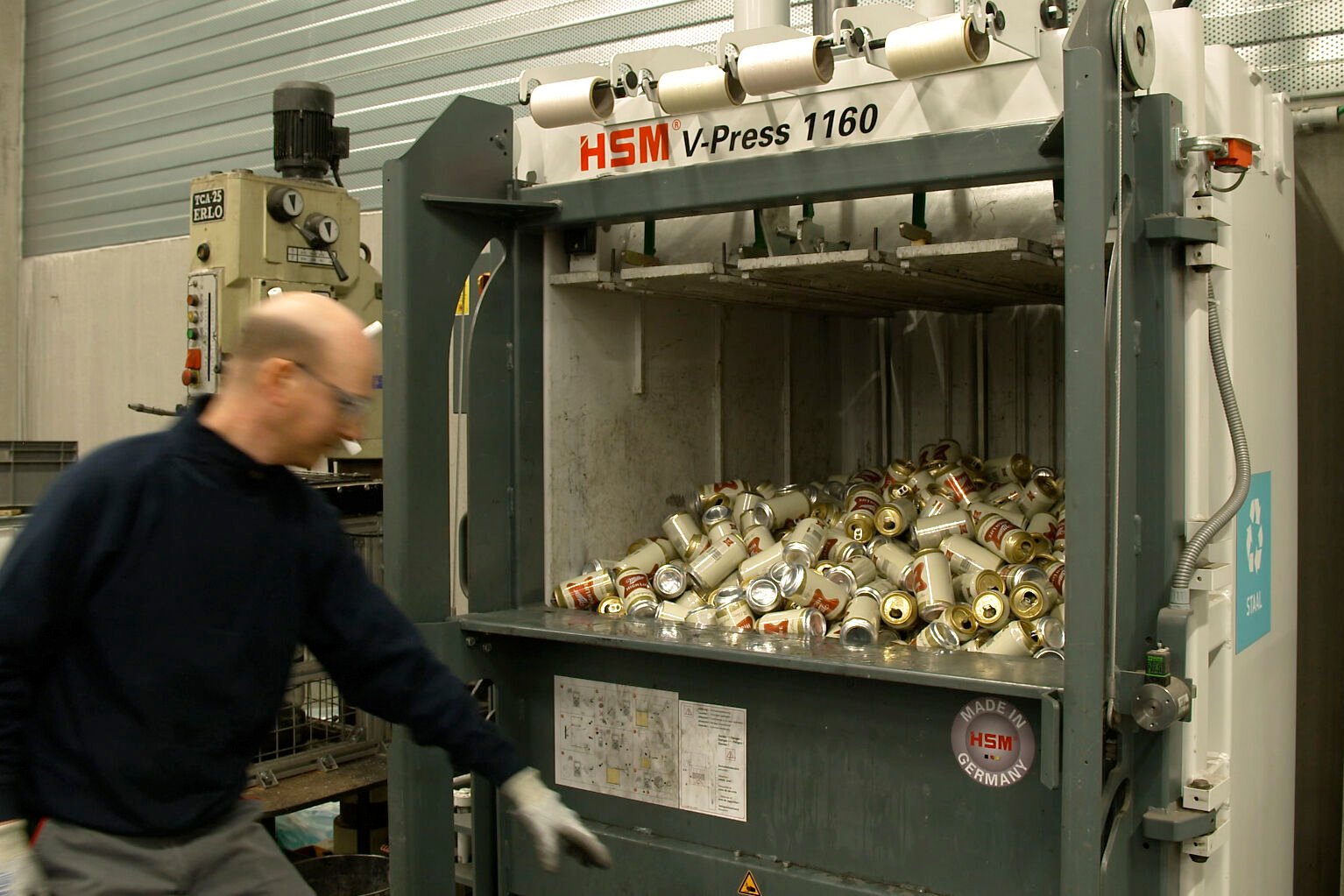 In this image provided by Comite Champagne, a worker prepares to press the button of a machine to crush empty Miller High Life beer cans at the Westlandia plant in Ypres, Belgium, Monday, April 17, 2023. Belgian customs have destroyed more than 2,000 cans of Miller High Life advertised as the ″Champagne of beers” at the request of houses and growers of the bubbly beverage. (Comite Champagne via AP)