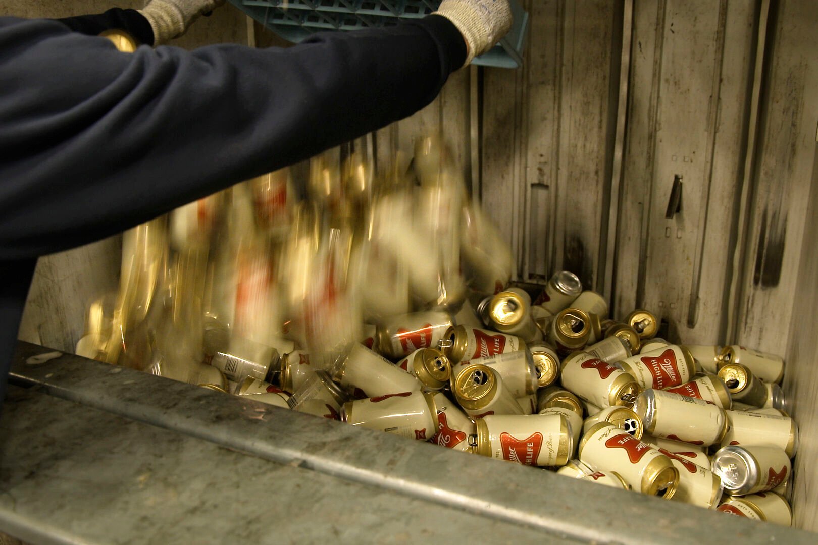 In this image provide by Comite Champagne, a worker dumps empty cans of Miller High Life beer into a machine to be crushed at the Westlandia plant in Ypres, Belgium, Monday, April 17, 2023. Belgian customs have destroyed more than 2,000 cans of Miller High Life advertised as the ″Champagne of beers” at the request of houses and growers of the bubbly beverage. (Comite Champagne via AP)