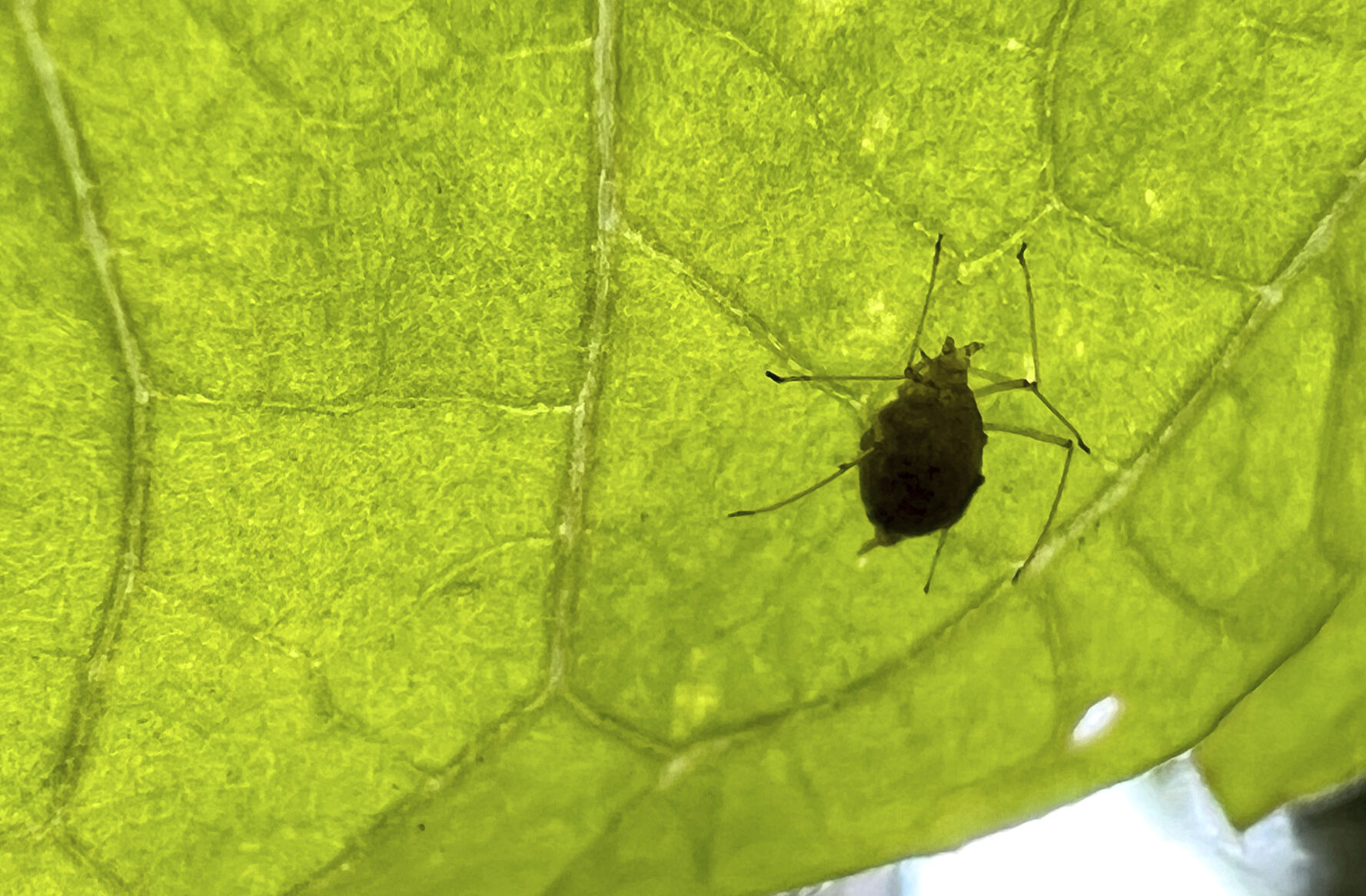 This July 5, 2023, image provided by Jessica Damiano shows an aphid under a tomato leaf on Long Island, NY. The poppy seed-sized insects, which use their piercing, sucking mouthparts to drain sap from plant leaves and stems, can be removed with a blast of hose water. (Jessica Damiano via AP)