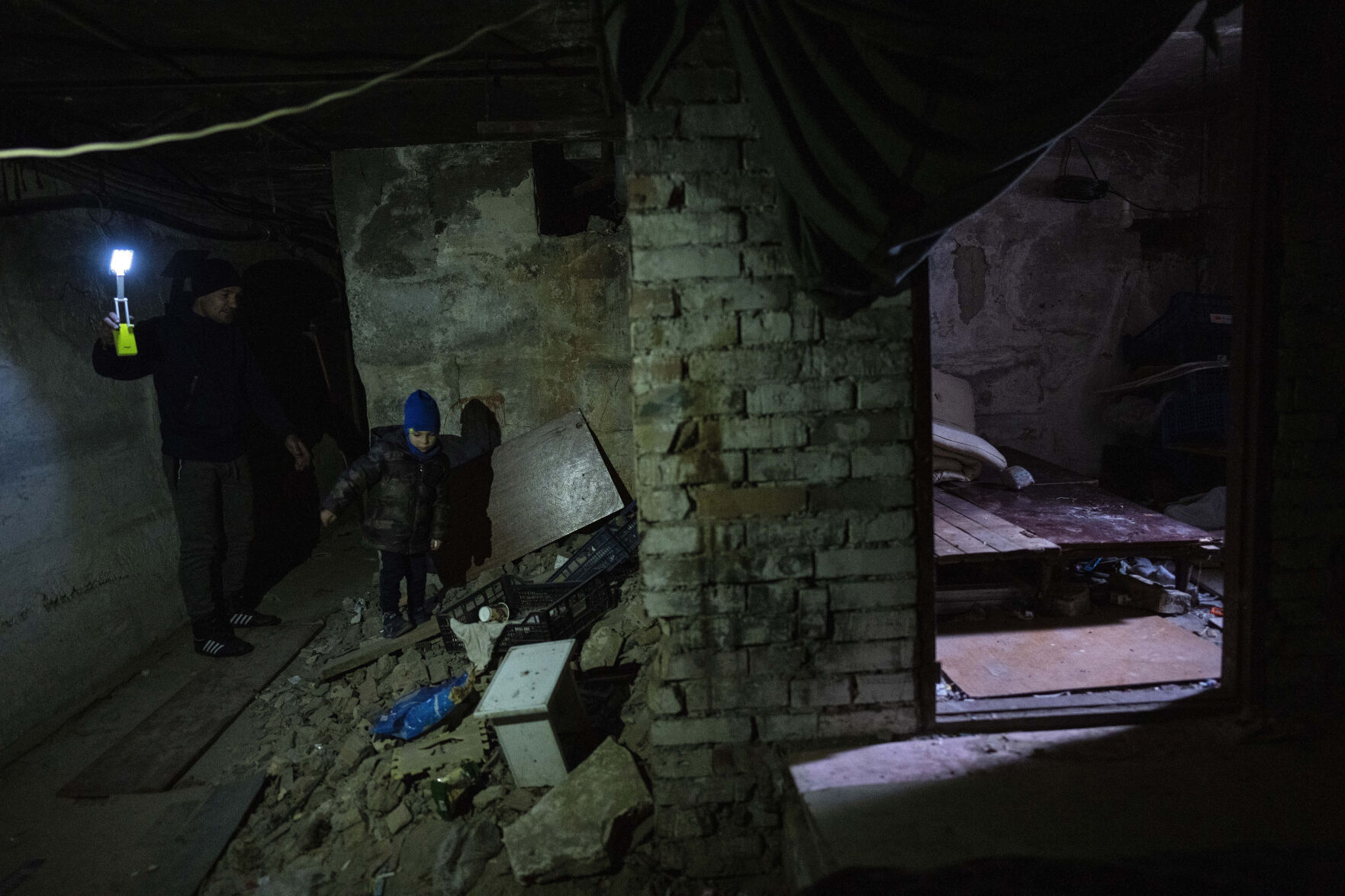 Vlad, 6, walks with his father Ivan inside a basement where they stayed in Bucha, on the outskirts of Kyiv, Ukraine.