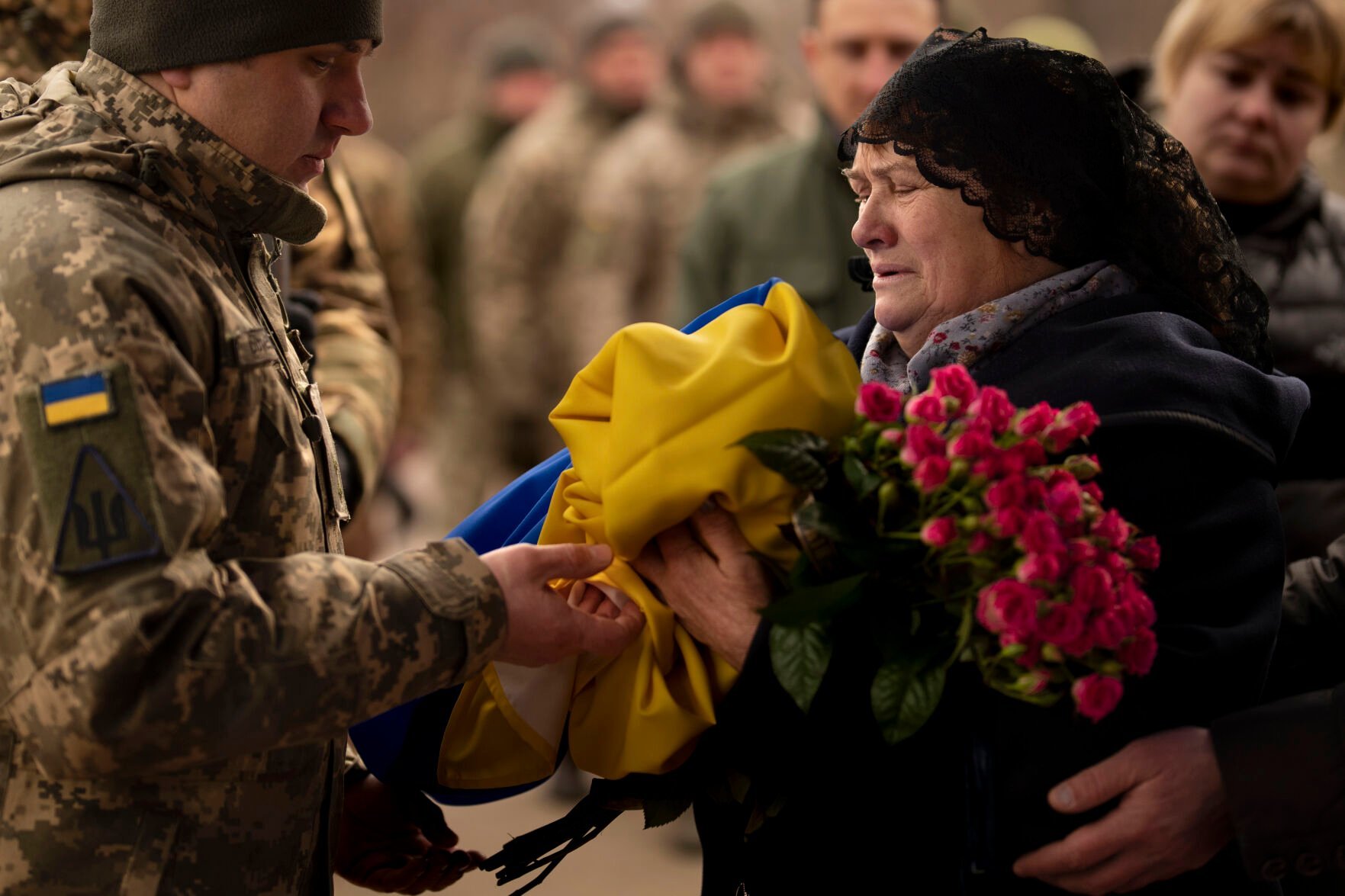 Tetiana Hurieieva, mother of Volodymyr Hurieiev, a Ukrainian soldier killed in the Bakhmut area, receives the flag that draped his coffin Saturday during the funeral in Boryspil, Ukraine.