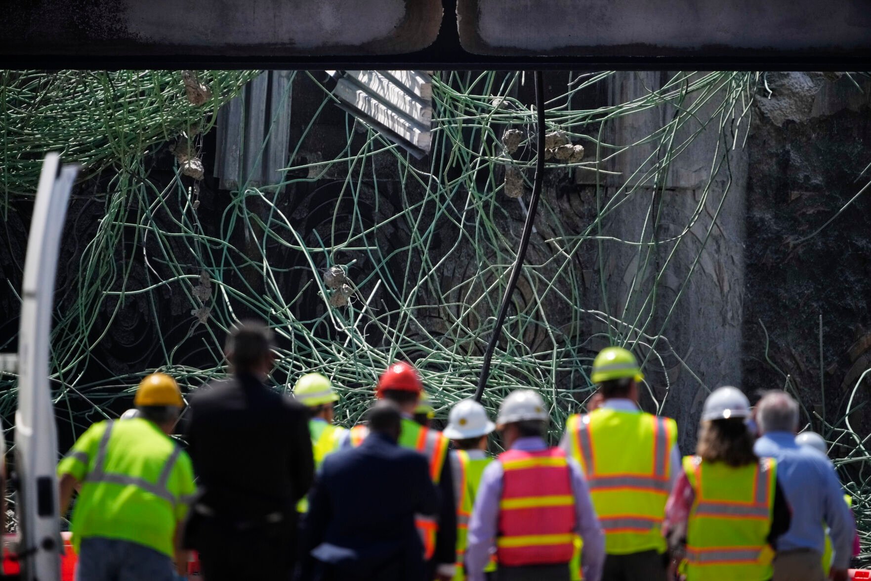 Officials, including U.S. Transportation Secretary Pete Buttigieg, view the scene of a collapsed elevated section of Interstate 95, in Philadelphia, Tuesday, June 13, 2023.