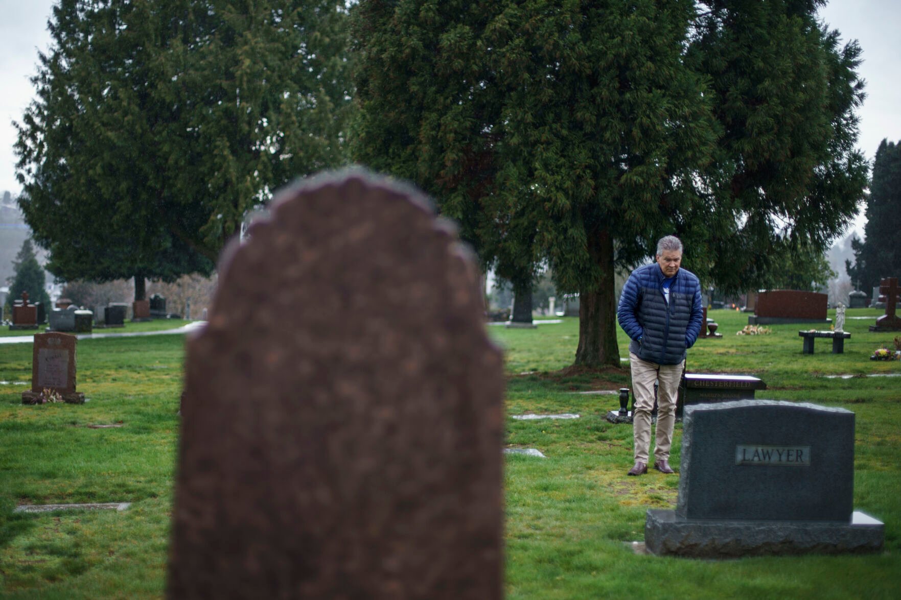 David Lawyer visits the grave of his father, Neil Lawyer, for the first time since the inscription went up on his tombstone in Seattle on March 20, 2022.