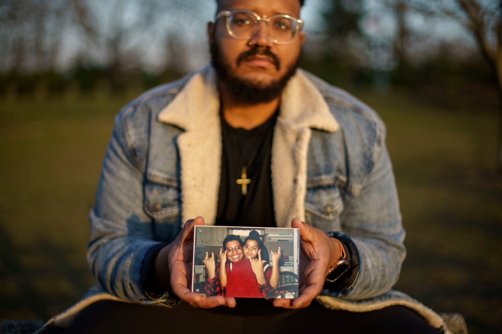 Adam Almonte holds a photo of him with his older brother, Fernando Morales, on a bench where they used to sit and eat tuna sandwiches after playing catch in Fort Tryon Park in New York. Morales died April 7, 2020, from COVID-19 at age 43.