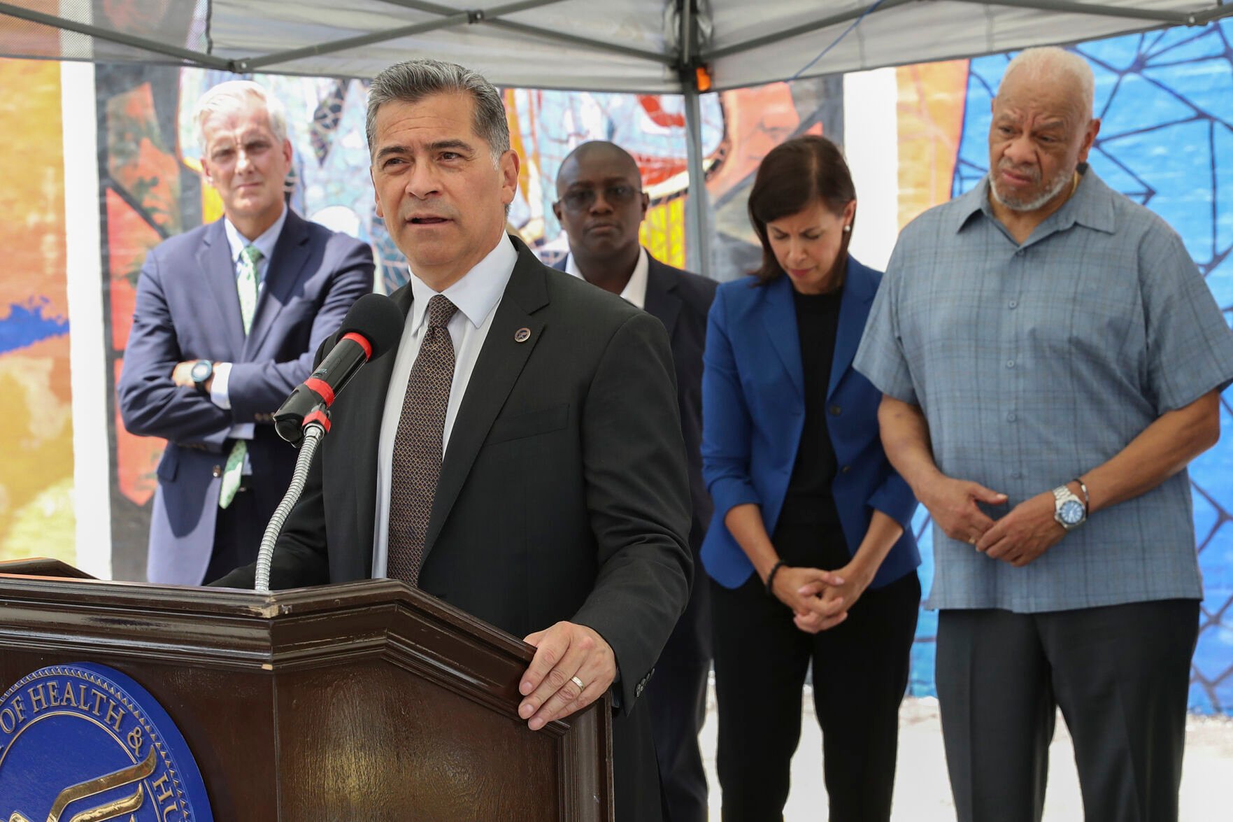 Xavier Becerra, Secretary of the Department of Health and Human Services, speaks at the podium during a press conference on the kickoff of the 988 helpline on July 15, 2022, in West Philadelphia.