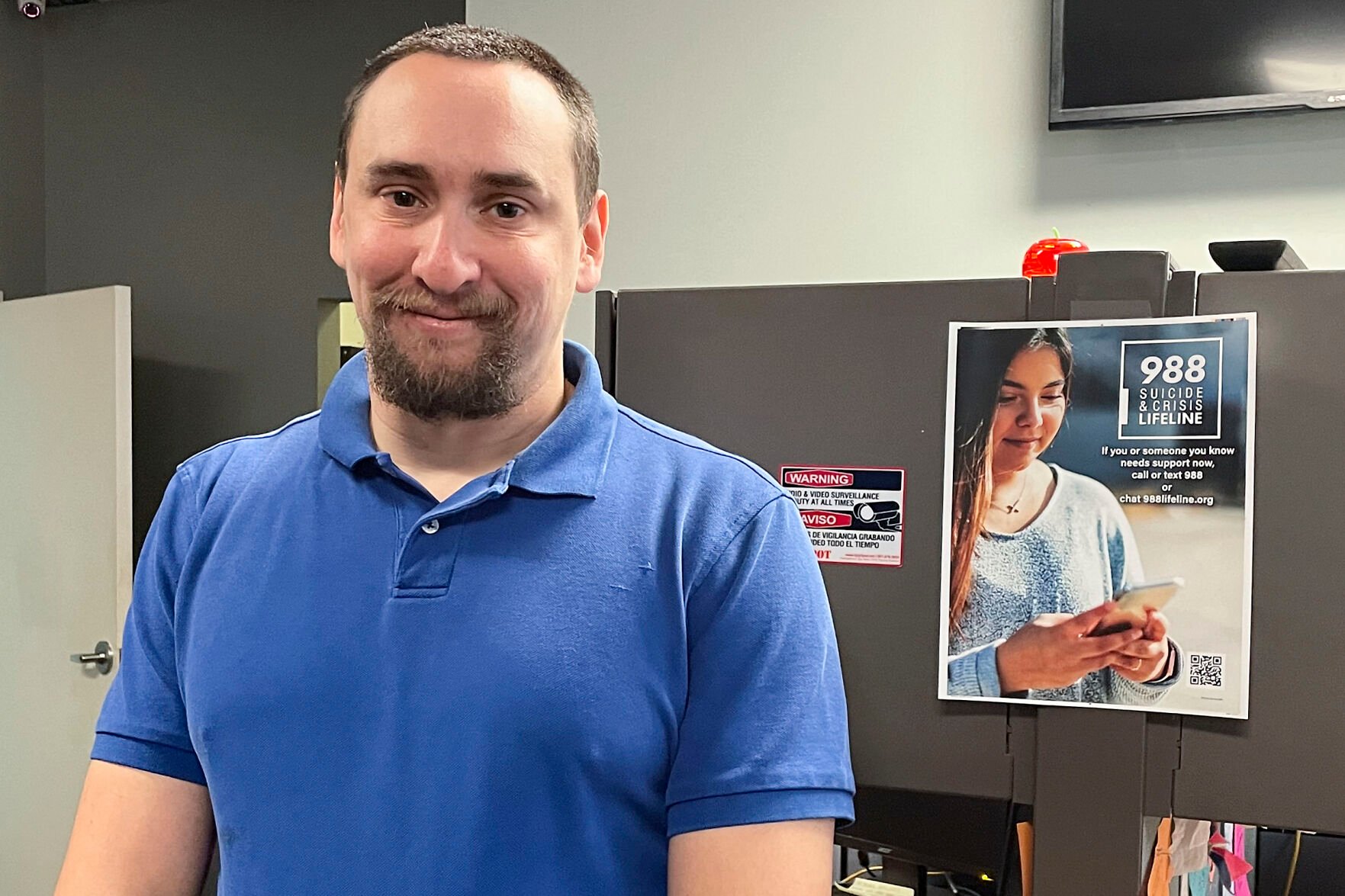 988 Call Center Director Jamieson Brill poses for a photo on Oct. 7, 2022, at a facility in Hyattsville, Md. Brill works in one of more than 200 call centers fanned out around the country tasked with answering an uptick in calls around the clock from people considering suicide or experiencing a mental health emergency.